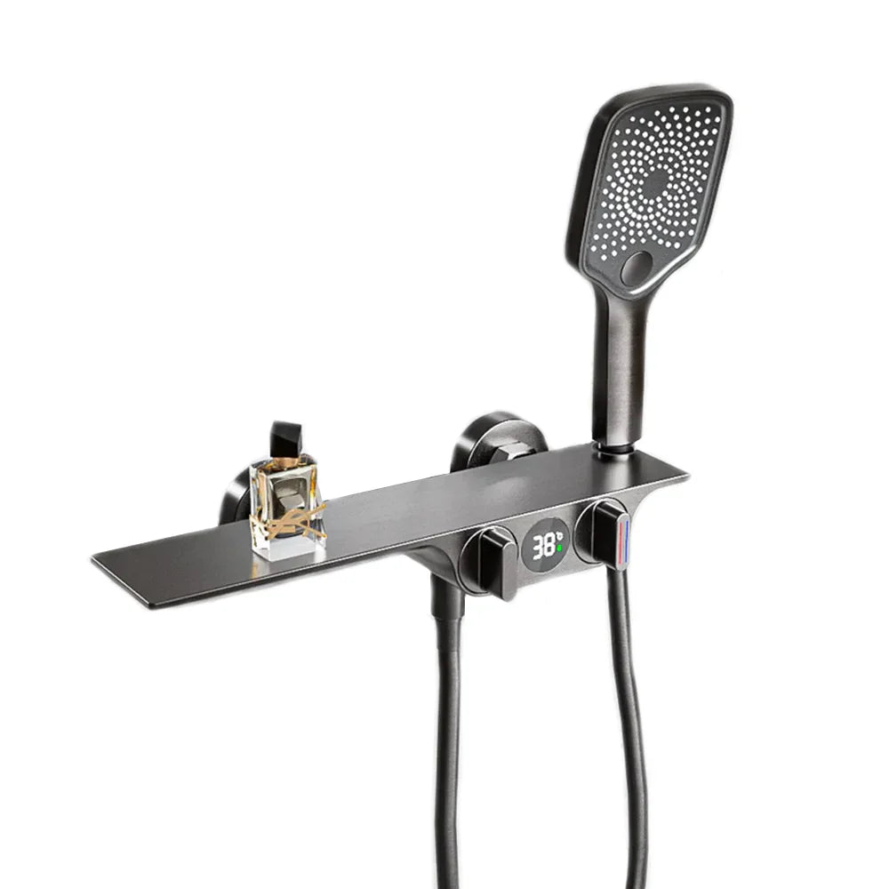 Notre robinet pour baignoire avec cascade, douchette et affichage numérique est l'atout charme de toute salle de bain moderne. En argenté chromé ou brossé en laiton, ce modèle associe esthétique et fonctionnalité, offrant un jet cascade apaisant et une douchette carrée, montés sur un élégant support mural façon tablette. Deux poignées rondes et un afficheur de température numérique embellissent son design.