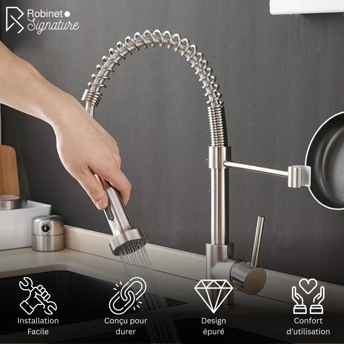 Chez RobinetSignature, nous concevons des robinets de cuisine qui allient design soigné, fiabilité durable et simplicité d’installation, pour accompagner votre cuisine, sans stress ni mauvaise surprise.