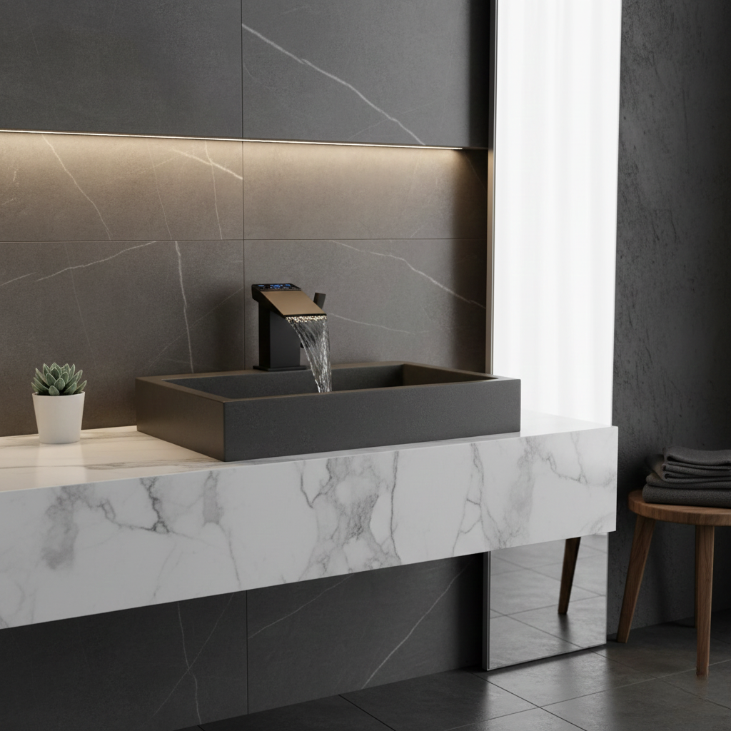 Pensé pour les salles de bain contemporaines, ce robinet de lavabo thermostatique en laiton noir mat associe design moderne et technologie avancée. Son écran numérique intégré affiche en temps réel la température de l’eau ainsi que la durée de l’écoulement en cascade, offrant une maîtrise précise et confortable à chaque utilisation. Ses lignes nettes, avec ou sans plaque de base selon la version choisie, apportent une touche élégante et minimaliste. Grâce à son mitigeur ergonomique, le réglage de la température s’effectue facilement, tandis que sa conception robuste garantit une durabilité exemplaire. Cette robinetterie salle de bain a été développée pour accompagner votre quotidien avec fiabilité et confort.